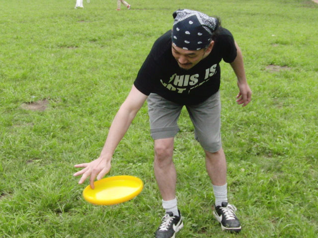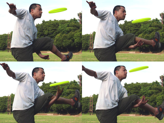 ディスクの中心を突いて、上に浮かせる技。普通に突くだけでなく、足の下や背中の後ろでもできます。また、手だけでなく、肘や膝、つま先でもできます。サッカーのリフティングみたく、連続で何回もできるとかっこ良し。